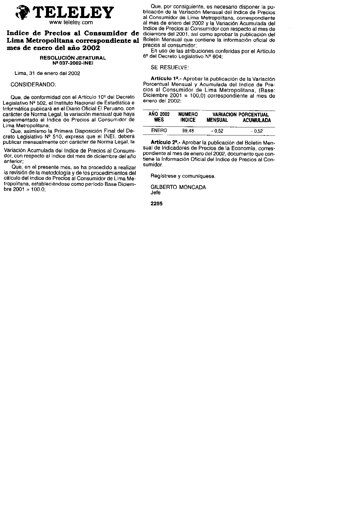 INDICE DE PRECIOS AL CONSUMIDOR DE LIMA METROPOLITANA CORRESPONDIENTE AL MES DE ENERO DEL AÑO 2002