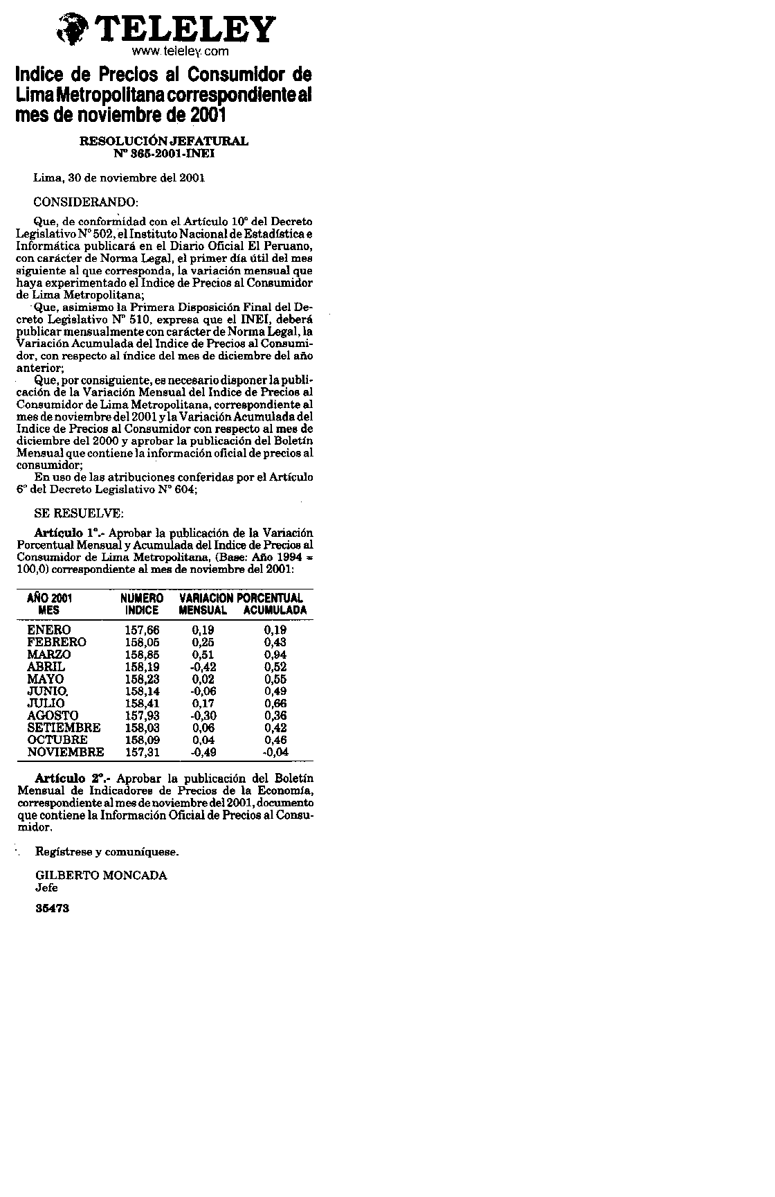 INDICE DE PRECIOS AL CONSUMIDOR DE LIMA METROPOLITANA CORRESPONDIENTE AL MES DE NOVIEMBRE DE 2001