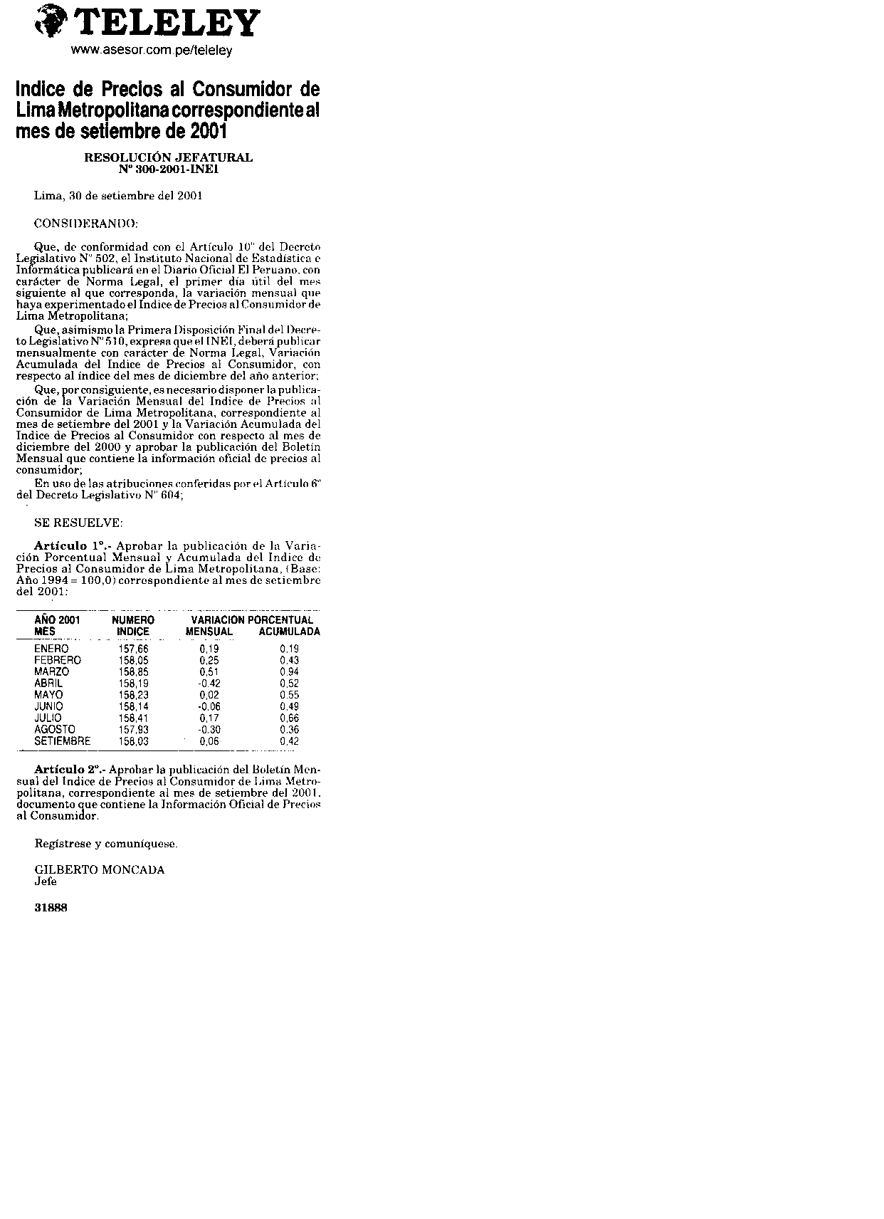 Indice de Precios al Consumidor de Lima Metropolitana correspondiente al mes de setiembre de 2001
