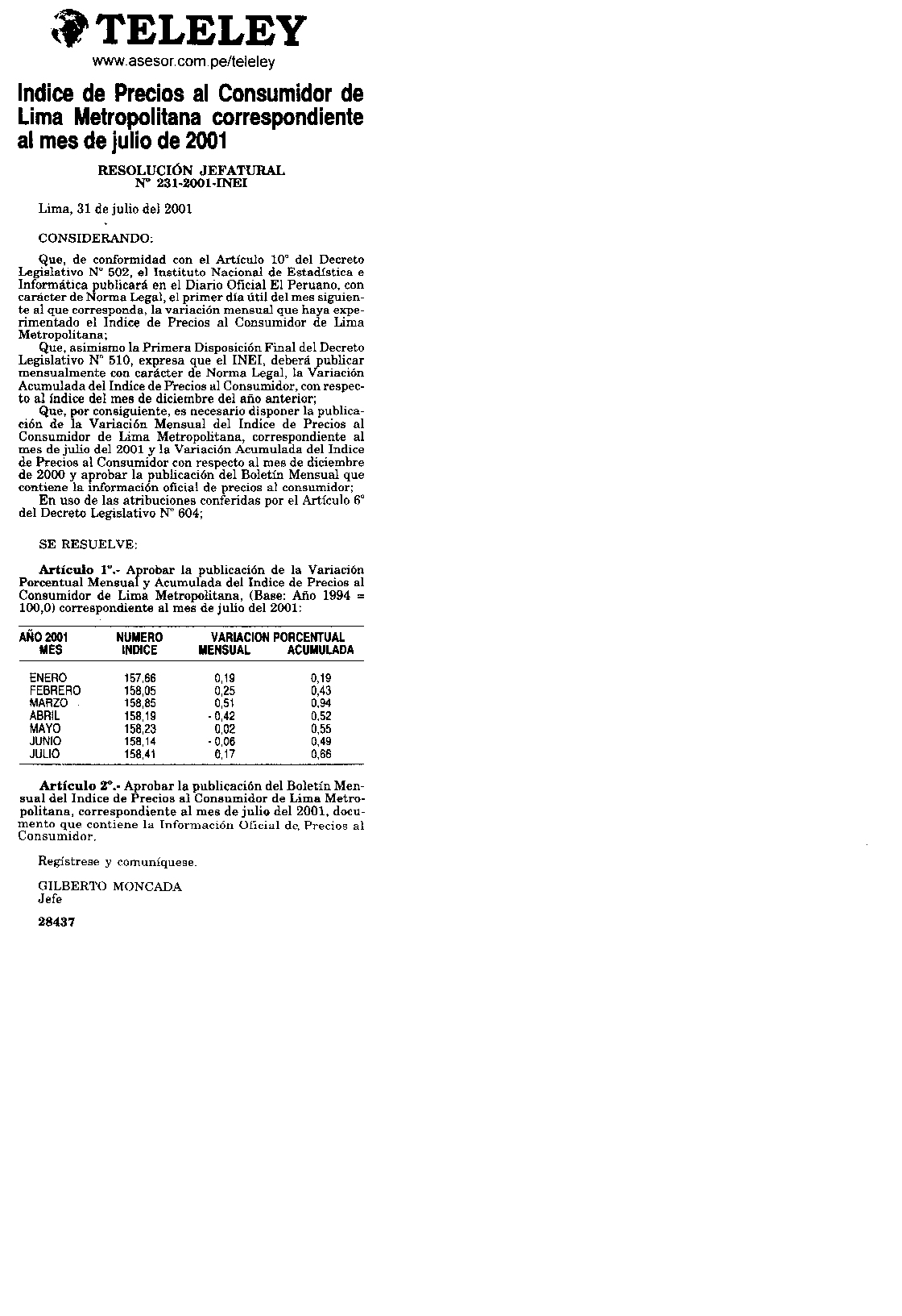 INDICE DE PRECIOS AL CONSUMIDOR DE LIMA METROPOLITANA CORRESPONDIENTE AL MES DE JULIO DEL AÑO 2001