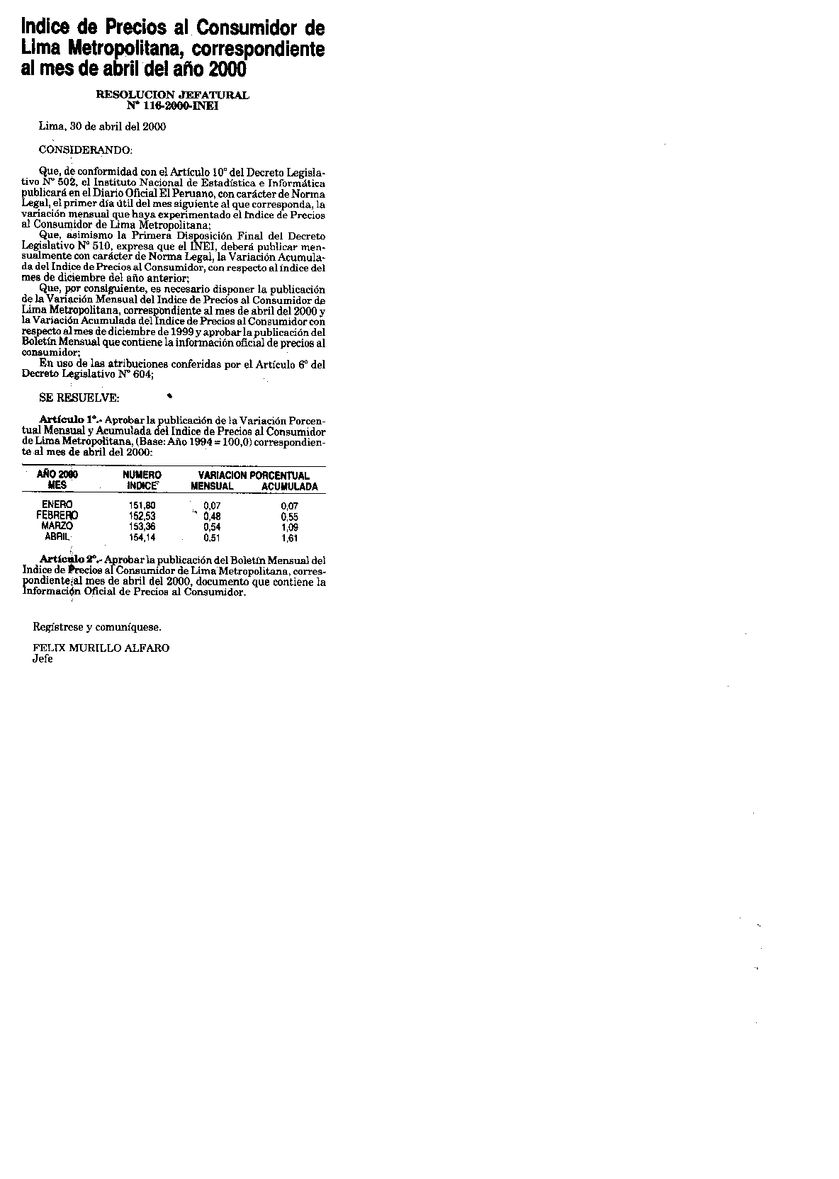 INDICE DE PRECIOS AL CONSUMIDOR DE LIMA METROPOLITANA, CORRESPONDIENTE AL MES DE ABRIL DEL AÑO 2000