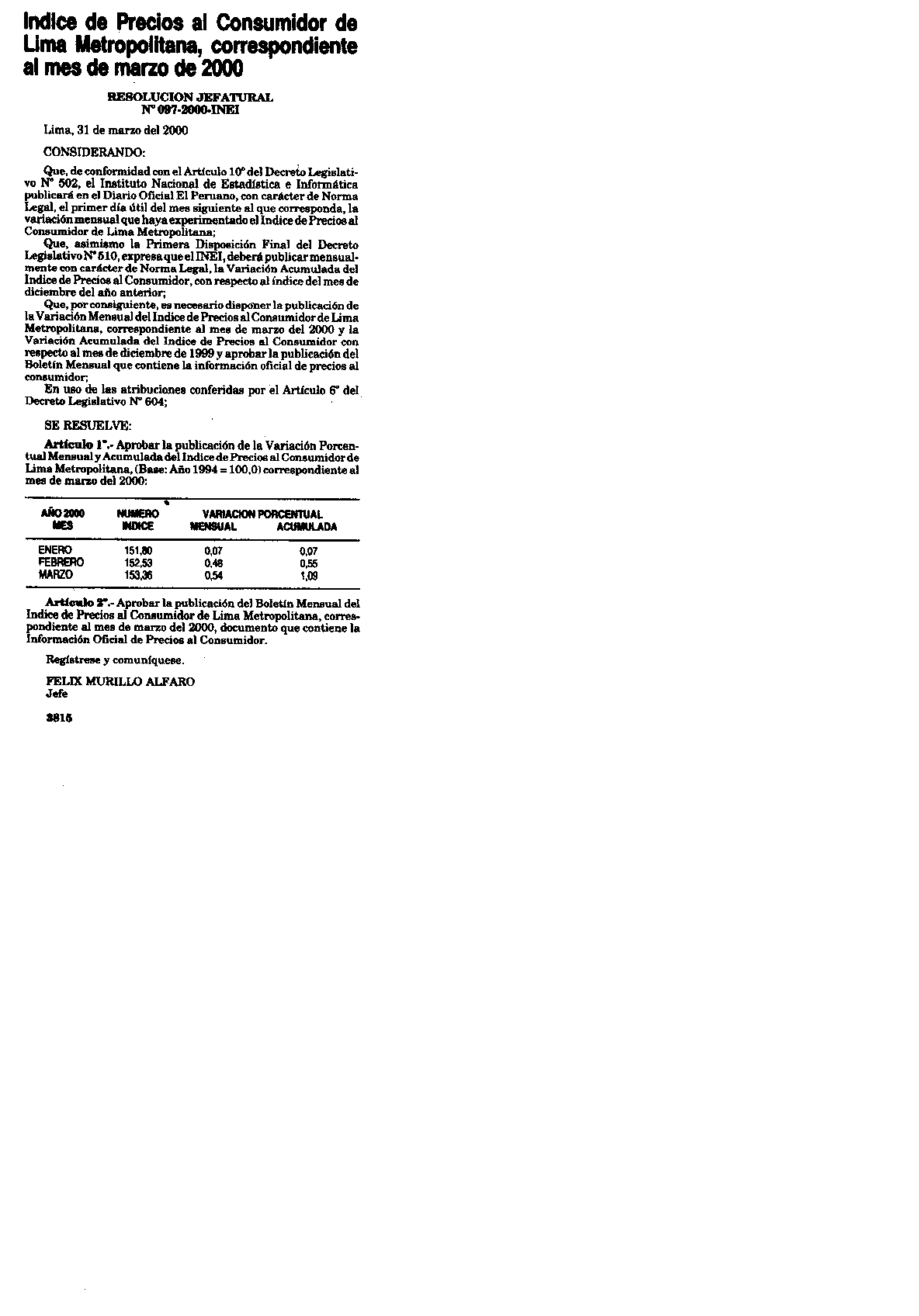 INDICE DE PRECIOS AL CONSUMIDOR DE LIMA METROPOLITANA,CORRESPONDIENTE AL MES DE MARZO DE 2000
