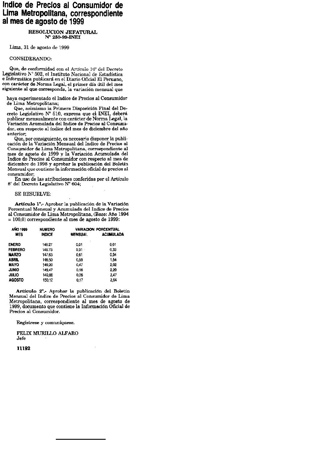 INDICE DE PRECIOS AL CONSUMIDOR DE LIMA METROPOLITANA, CORRESPONDIENTE AL MES DE AGOSTO DE 1999