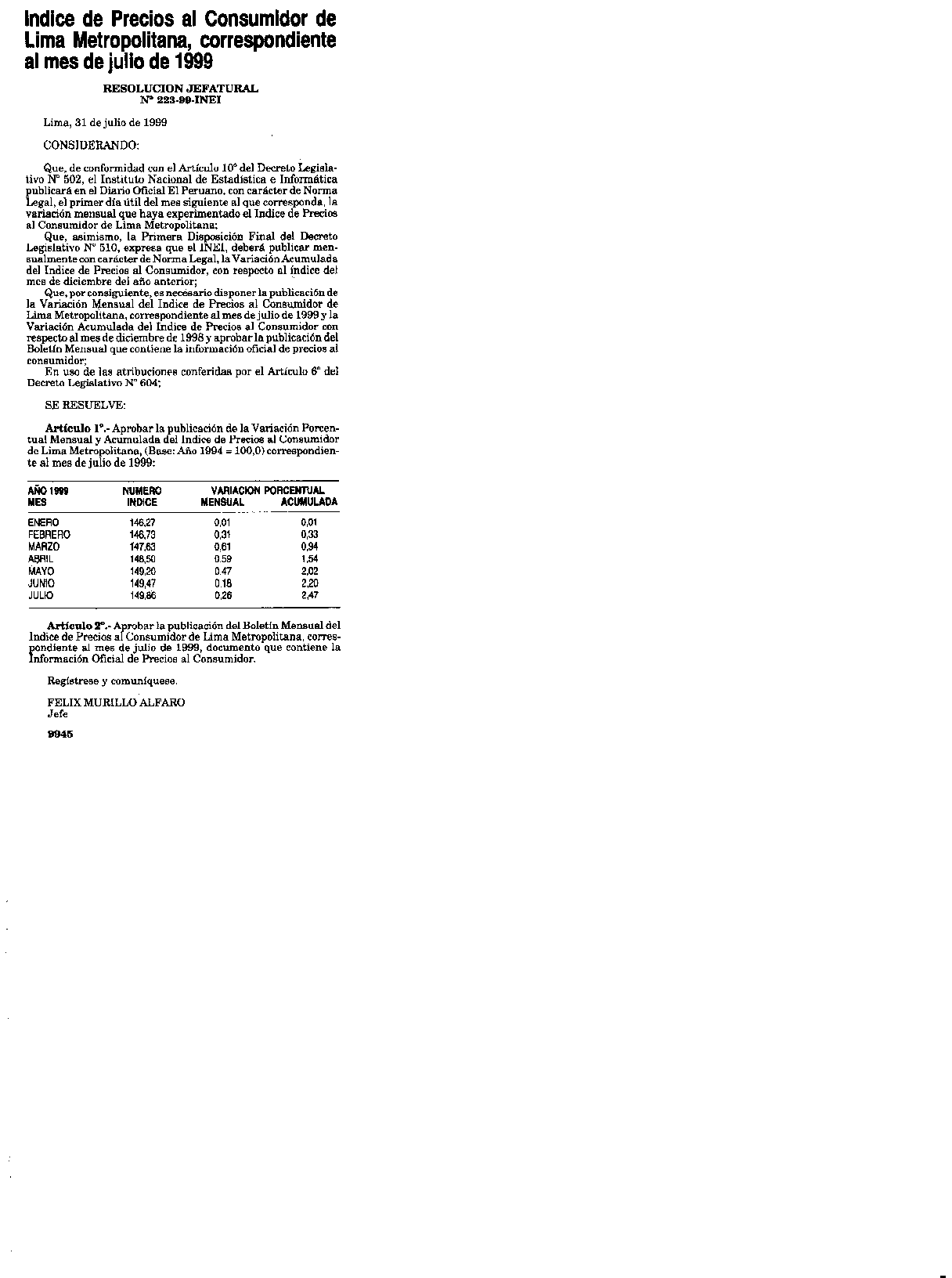 INDICE DE PRECIOS AL CONSUMIDOR DE LIMA METROPOLITANA, CORRESPONDIENTE AL MES DE JULIO DE 1999.