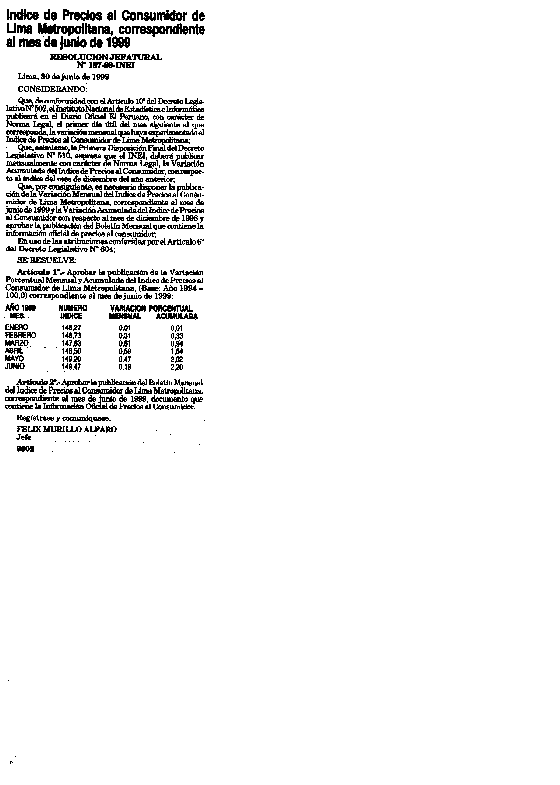 INDICE DE PRECIOS AL CONSUMIDOR DE LIMA METROPOLITANA, CORRESPONDIENTE AL MES DE JUNIO DE 1999