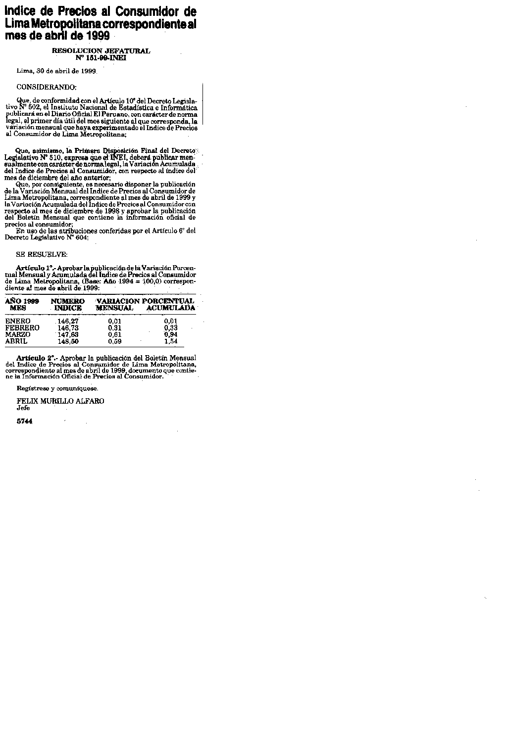 INDICE DE PRECIOS AL CONSUMIDOR DE LIMA METROPOLITANA CORRESPONDIENTE AL MES DE ABRIL DE 1999