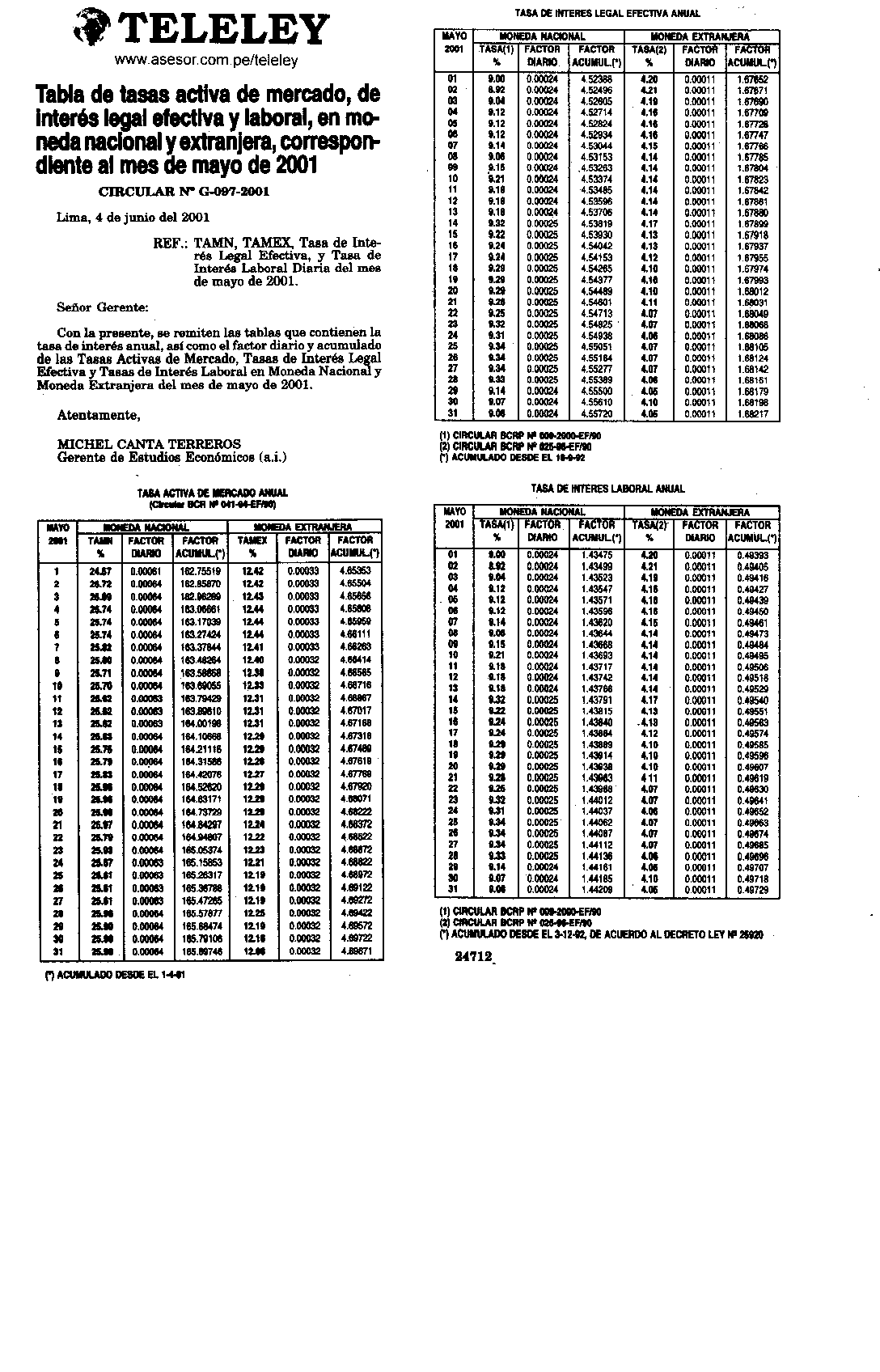 TABLA DE TASAS ACTIVA DE MERCADO, DE INTERÉS LEGAL EFECTIVA Y LABORAL, EN MONEDA NACIONAL Y EXTRANJERA, CORRESPONDIENTE AL MES DE MAYO DE 2001