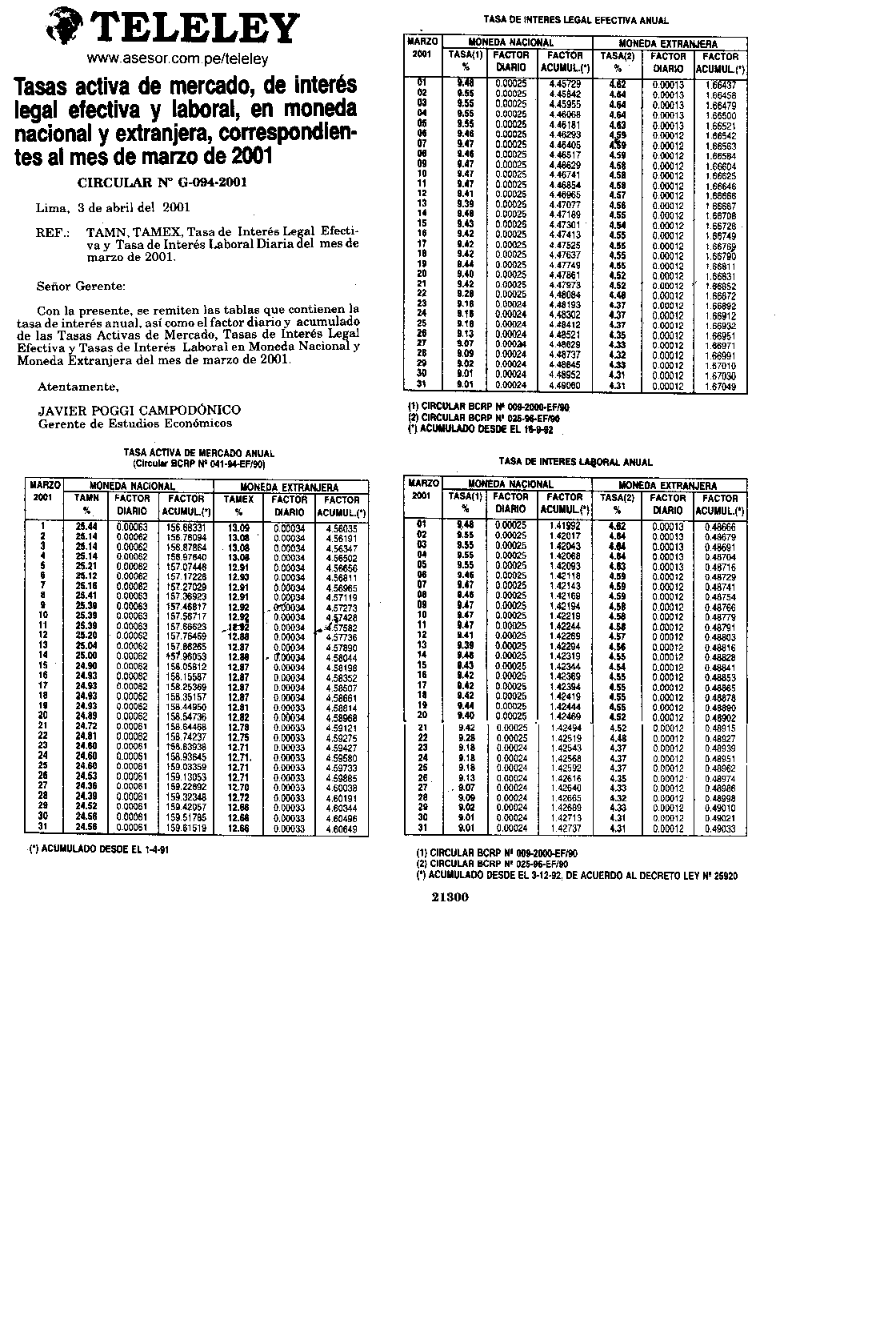 TASA ACTIVA DE MERCADO, DE INTERÉS LEGAL EFECTIVA Y LABORAL, EN MONEDA NACIONAL Y EXTRANJERA, CORRESPONDIENTES AL MES DE MARZO DE 2001