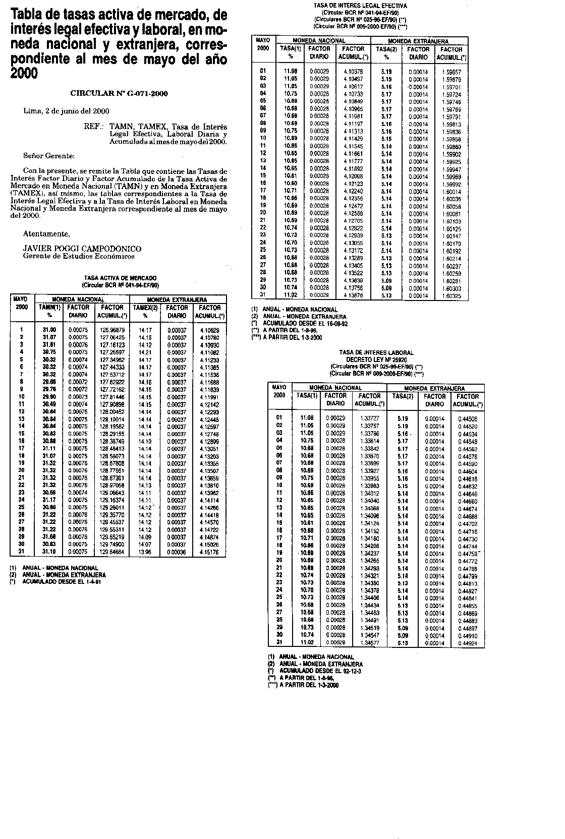 TABLA DE TASAS ACTIVA DE MERCADO, DE INTERÉS LEGAL EFECTIVA Y LABORAL, EN MONEDA NACIONAL Y EXTRANJERA, CORRESPONDIENTE AL MES DE MAYO DEL AÑO 2000