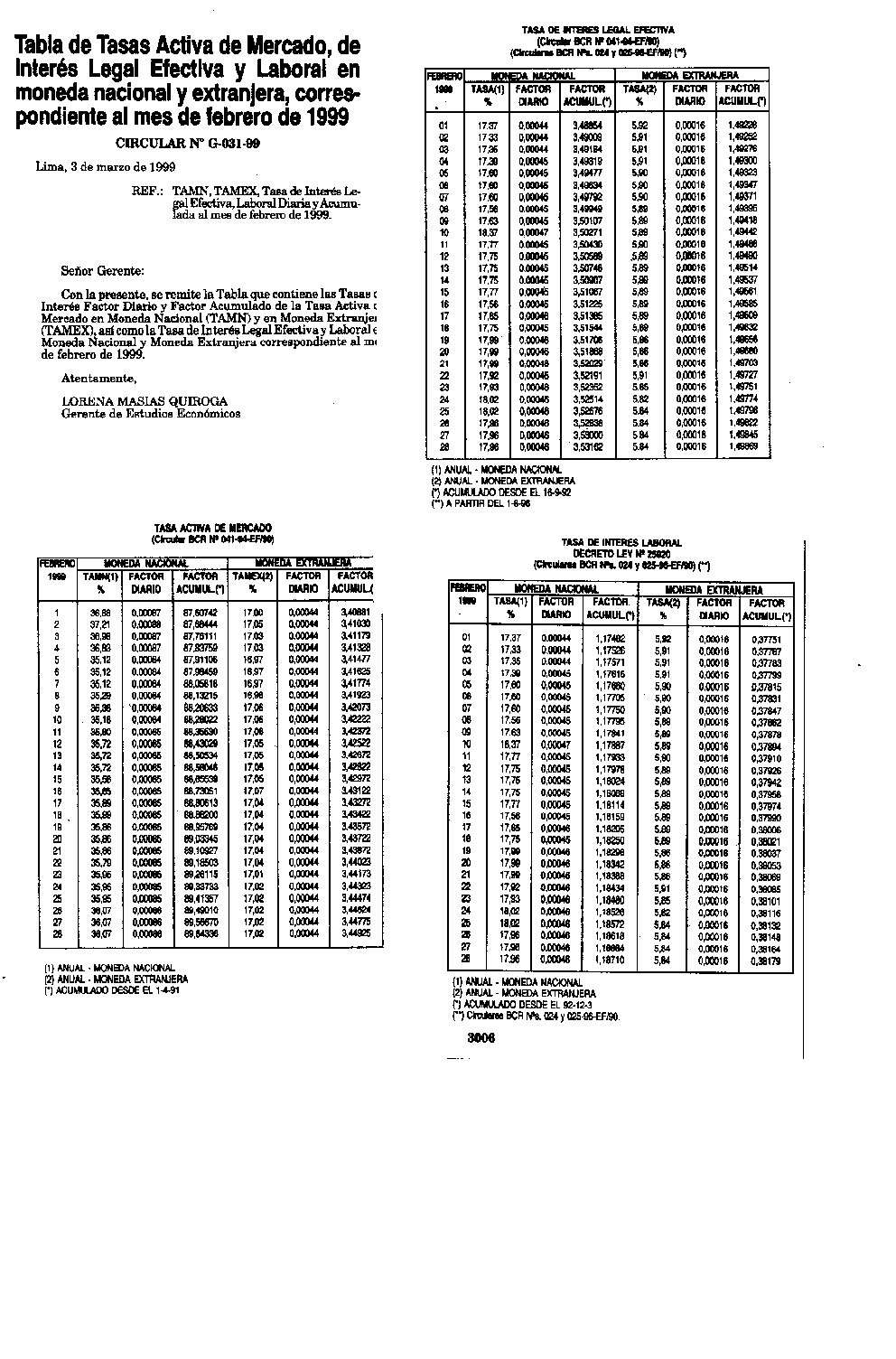 TABLA DE TASAS ACTIVA DE MERCADO, DE INTERES LEGAL EFECTIVA Y LABORAL EN MONEDA NACIONAL Y EXTRANJERA, CORRESPONDIENTE AL MES DE FEBRERO DE 1999