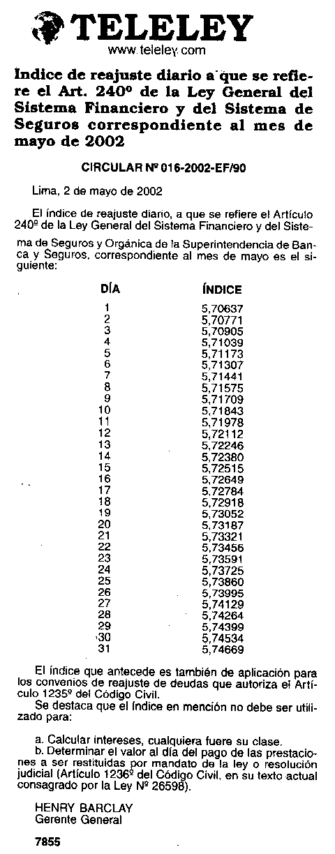 INDICE DE REAJUSTE DIARIO A QUE SE REFIERE EL ART. 240º DE LA LEY GENERAL DEL SISTEMA FINANCIERO Y DEL SISTEMA DE SEGUROS CORRESPONDIENTE AL MES DE MAYO DE 2002