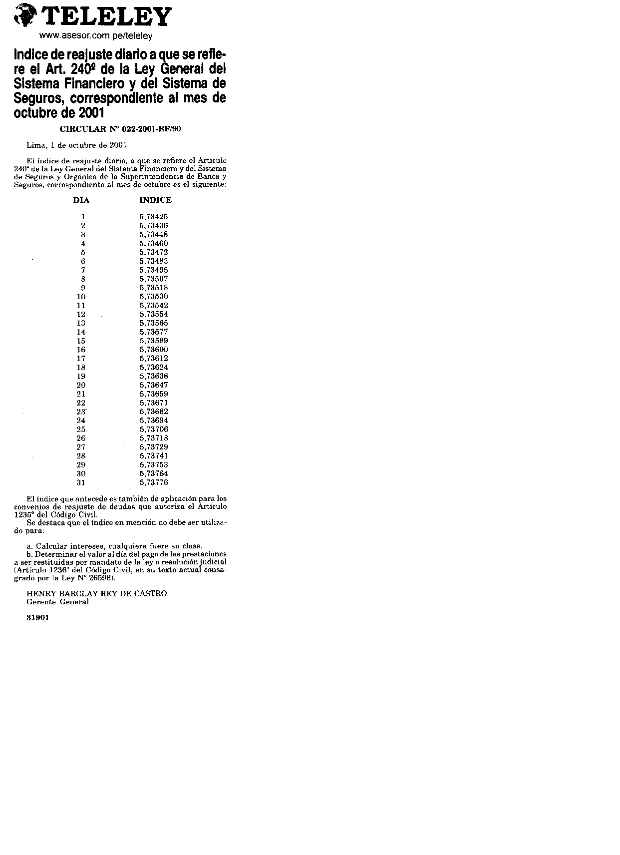Indice de reajuste diario a que se refiere el Art. 240 de la Ley General del Sistema Financiero y del Sistema de Seguros , correspondiente al mes de octubre de 2001