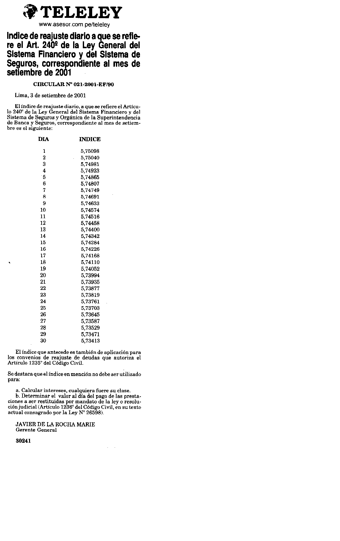 ÍNDICE DE REAJUSTE DIARIO A QUE SE REFIERE EL ART. 240° DE LA LEY GENERAL DEL SISTEMA FINANCIERO Y DEL SISTEMA DE SEGUROS, CORRESPONDIENTE AL MES DE SETIEMBRE DE 2001