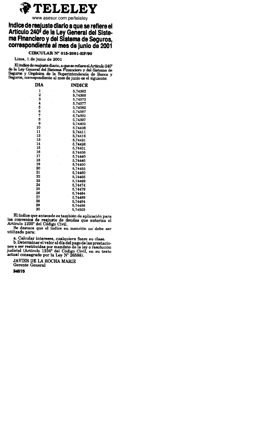 ÍNDICE DE REAJUSTE DIARIO A QUE SE REFIERE EL ARTÍCULO 240° DE LA LEY GENERAL DEL SISTEMA FINANCIERO Y DEL SISTEMA DE SEGUROS,CORRESPONDIENTE AL MES DE JUNIO DE 2001