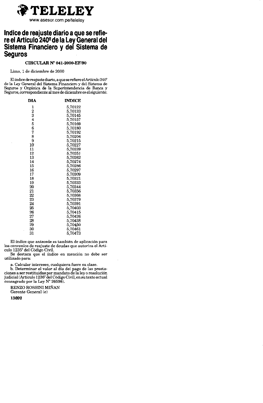 INDICE DE REAJUSTE DIARIO A QUE SE REFIERE EL ARTÍCULO 240º DE LA LEY GENERAL DEL SISTEMA FINANCIERO Y DEL SISTEMA DE SEGUROS
