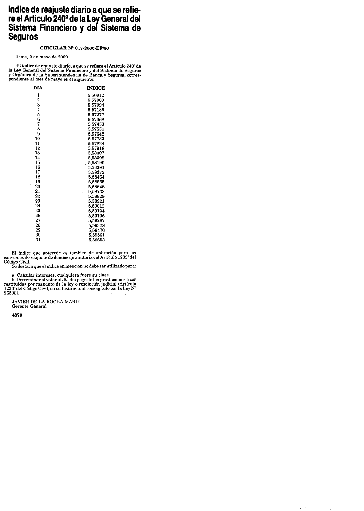 INDICE DE REAJUSTE DIARIO A QUE SE REFIERE EL ARTÍCULO 240º DE LA LEY GENERAL DEL SISTEMA FINANCIERO Y DEL SISTEMA DE SEGUROS