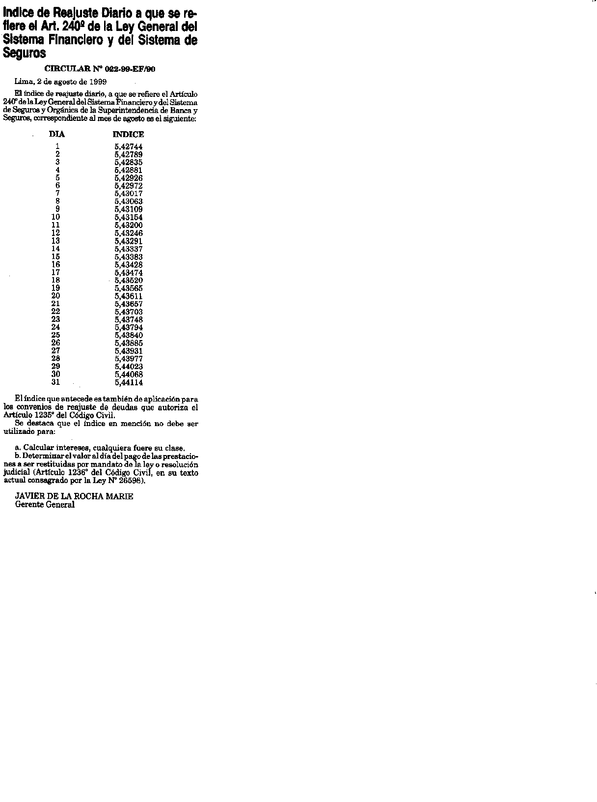 INDICE DE REAJUSTE DIARIO A QUE SE REFIERE EL ARTÍCULO 240 DE LA LEY GENERAL DEL SISTEMA FINANCIERO Y DEL SISTEMA DE SEGUROS