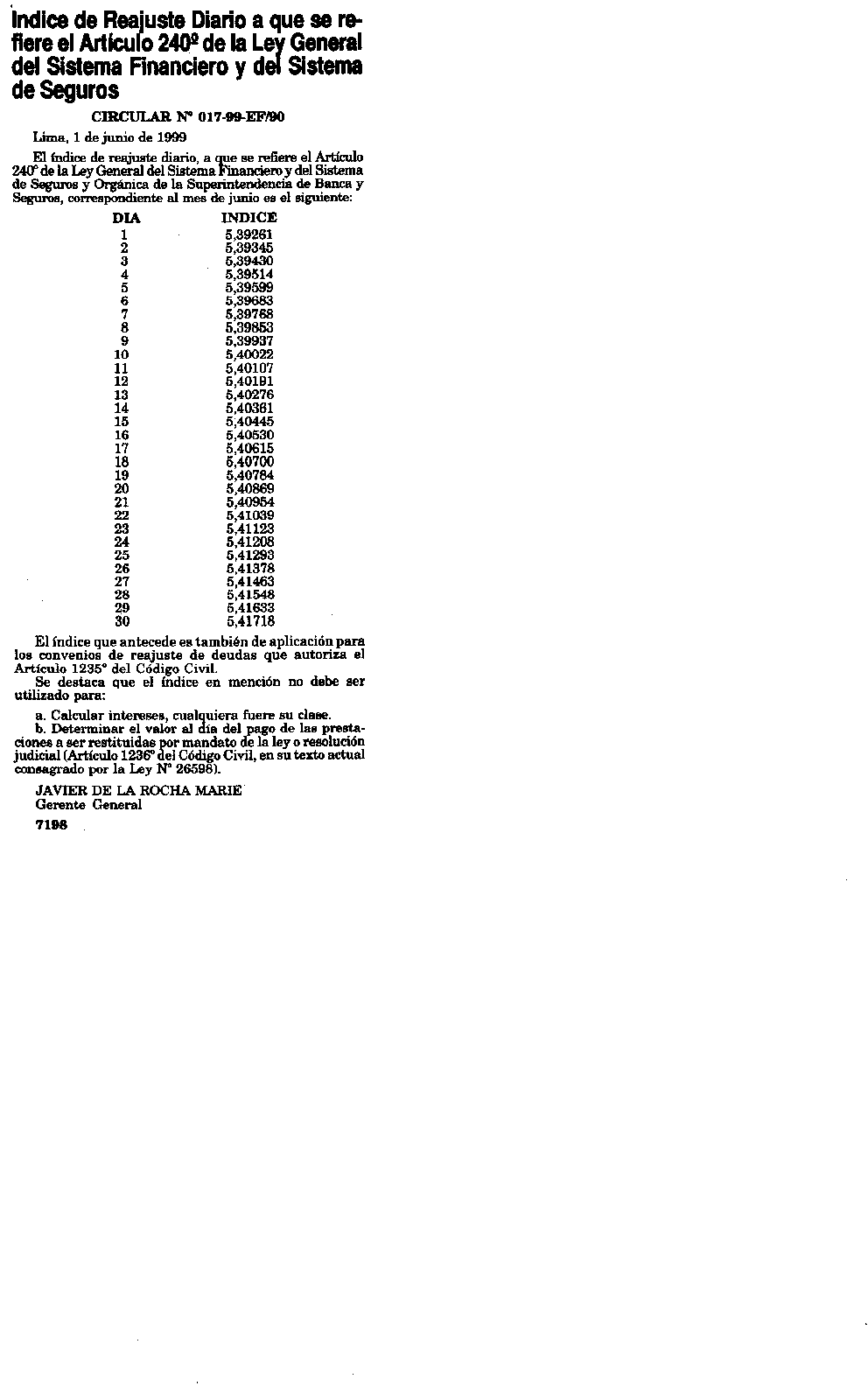INDICE DE REAJUSTE DIARIO A QUE SE REFIERE EL ARTÍCULO 240 DE LA LEY GENERAL DEL SISTEMA FINANCIERO Y DEL SISTEMA DE SEGUROS