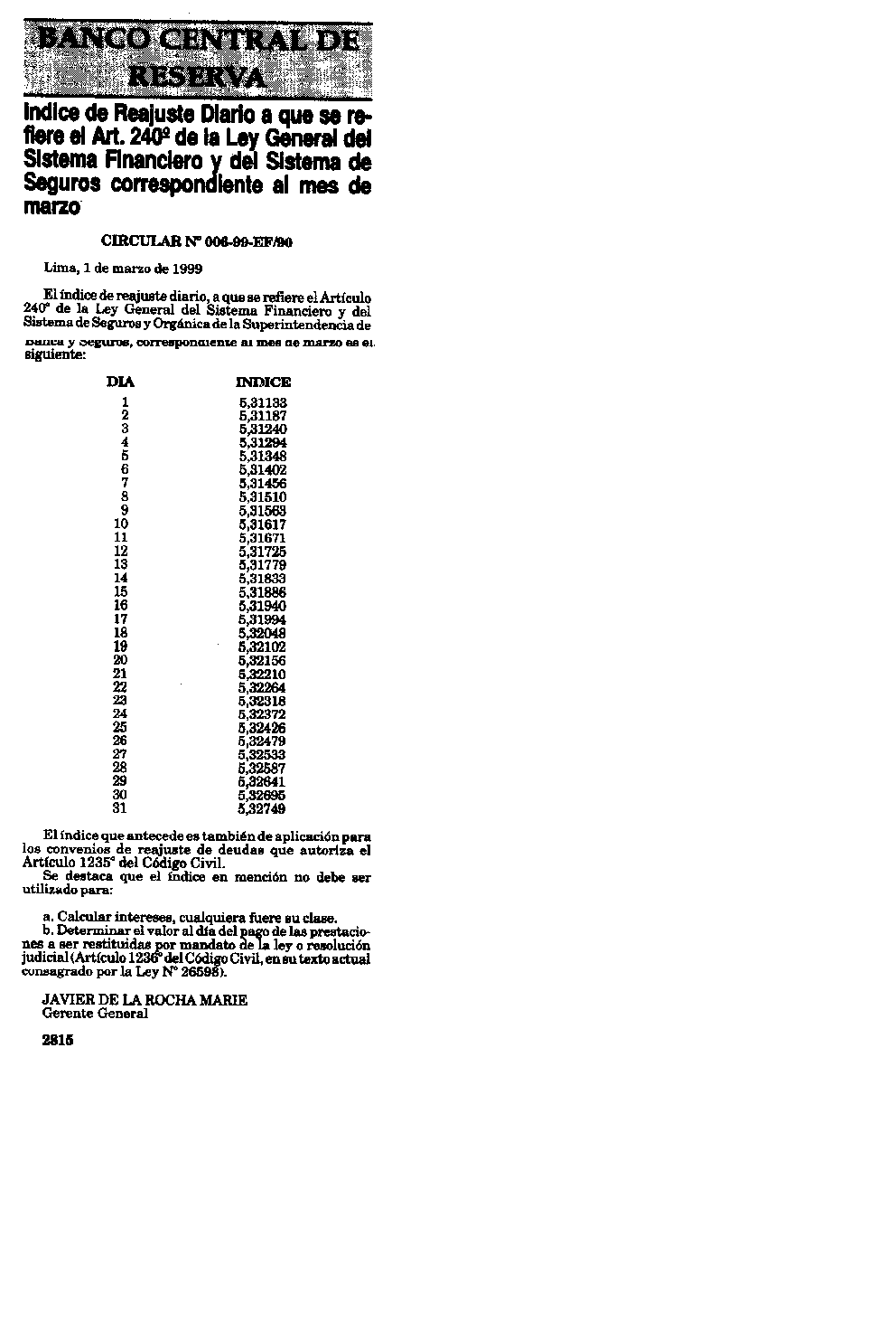 INDICE DE REAJUSTE DIARIO A QUE SE REFIERE EL ART. 240 DE LA LEY GENERAL DEL SISTEMA FINANCIERO Y DEL SISTEMA DE SEGUROS CORRESPONDIENTE AL MES DE MARZO