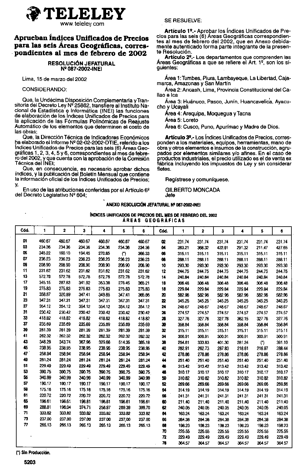 APRUEBAN INDICES UNIFICADOS DE PRECIOS PARA LAS SEIS ÁREAS GEOGRÁFICAS CORRESPONDIENTES AL MES DE FEBRERO DE 2002