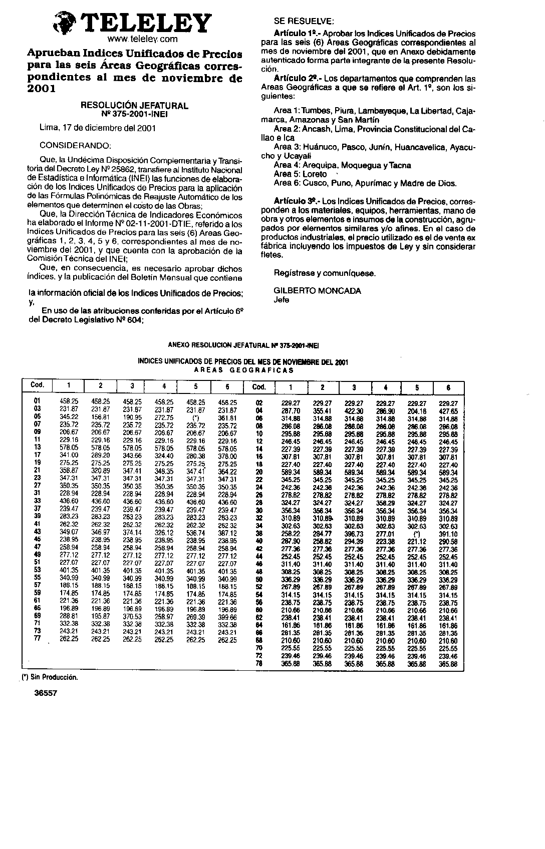 APRUEBAN INDICES UNIFICADOS DE PRECIOS PARA LAS SEIS AREAS GEOGRÁFICAS CORRESPONDIENTES AL MES DE NOVIEMBRE DE 2001