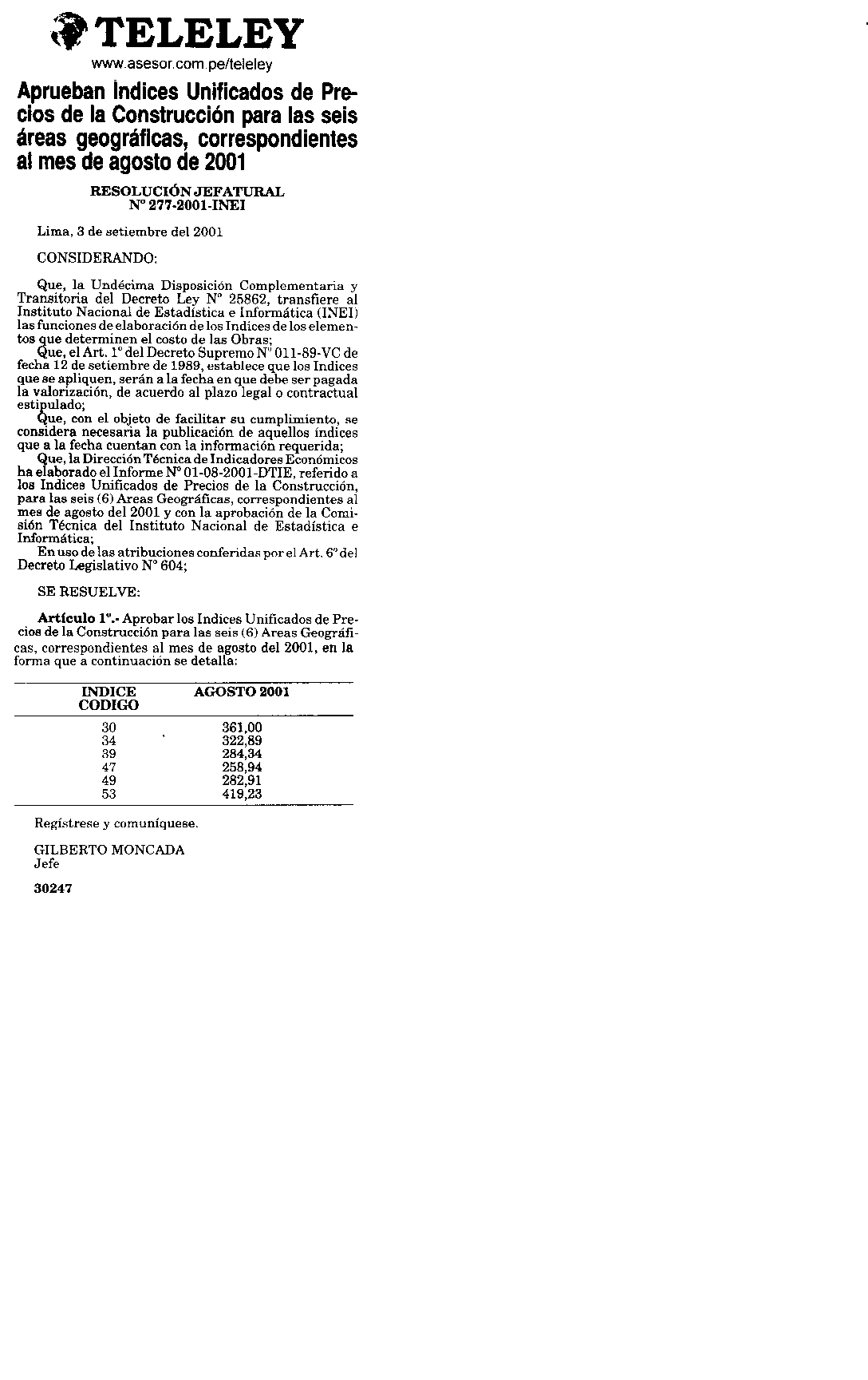 APRUEBAN INDICES UNIFICADOS DE PRECIOS DE LA CONSTRUCCIÓN PARA LAS SEIS ÁREAS GEOGRÁFICAS, CORRESPONDIENTES AL MES DE AGOSTO DE 2001