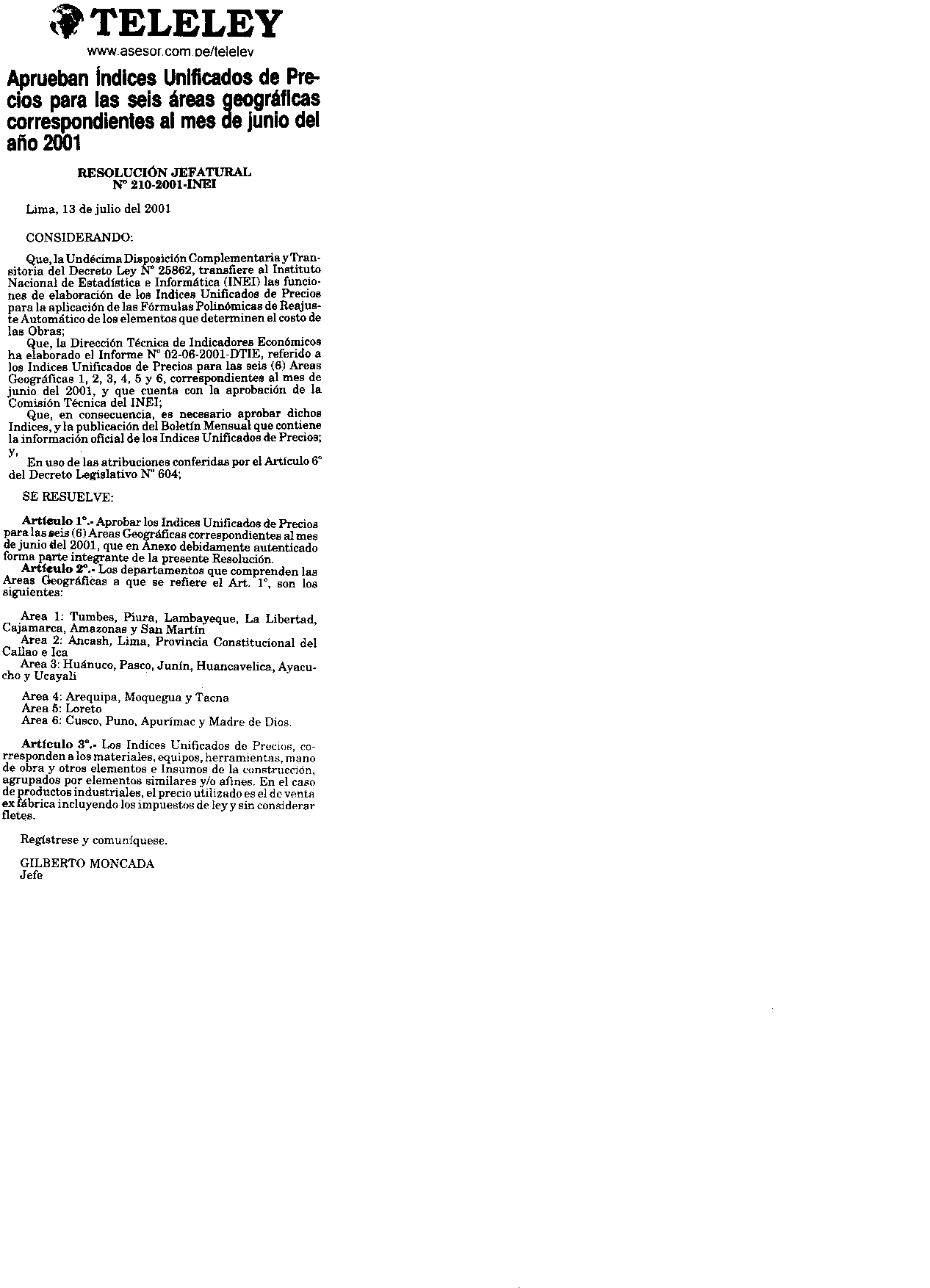 Aprueban Indices Unificados de Precios para las seis áreas geográficas correspondientes al mes de junio del año 2001
