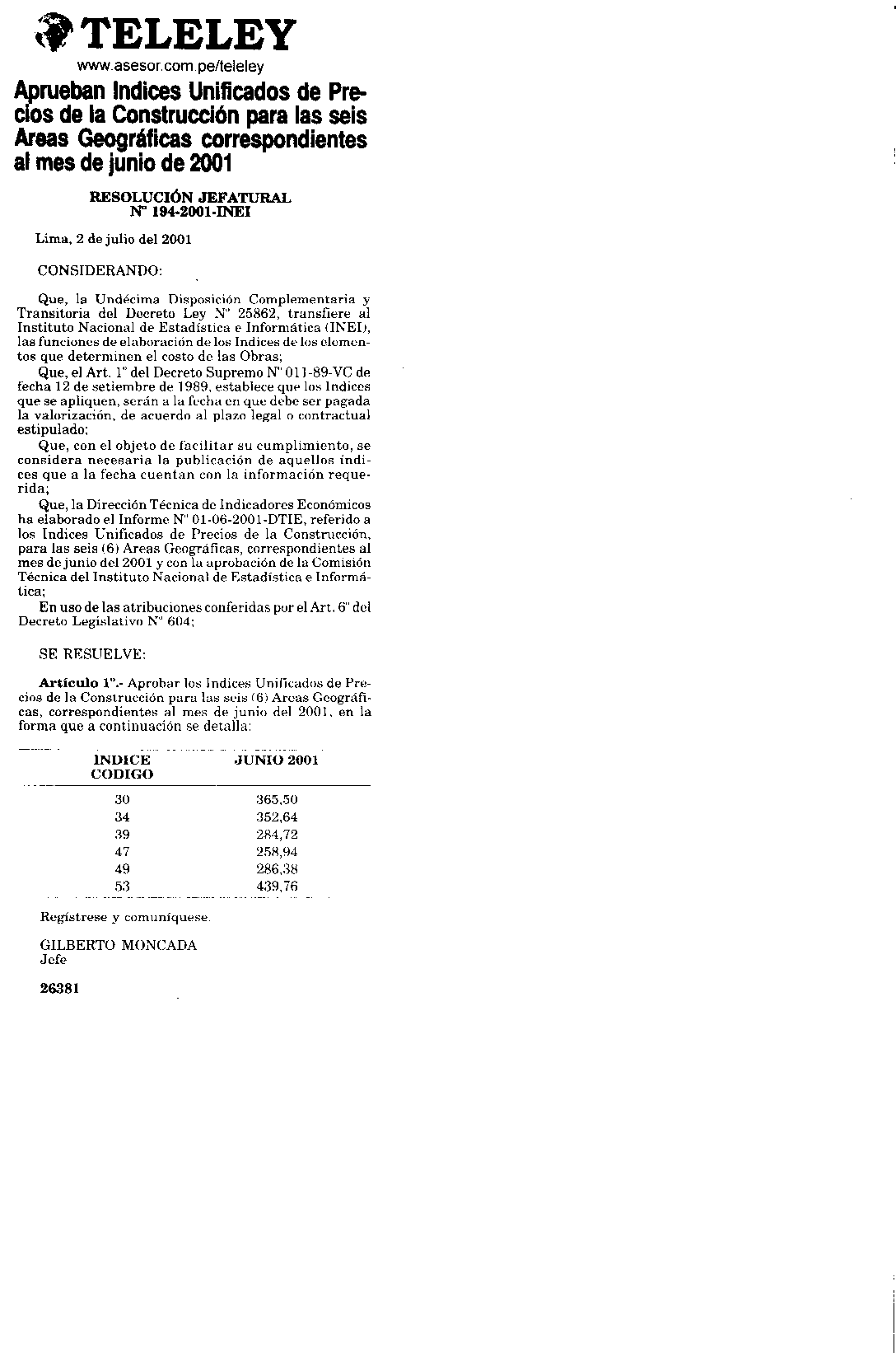 APRUEBAN ÍNDICES UNIFICADOS DE PRECIOS DE LA CONSTRUCCIÓN PARA LAS SEIS ÁREAS GEOGRÁFICAS CORRESPONDIENTES AL MES DE JUNIO DE 2001