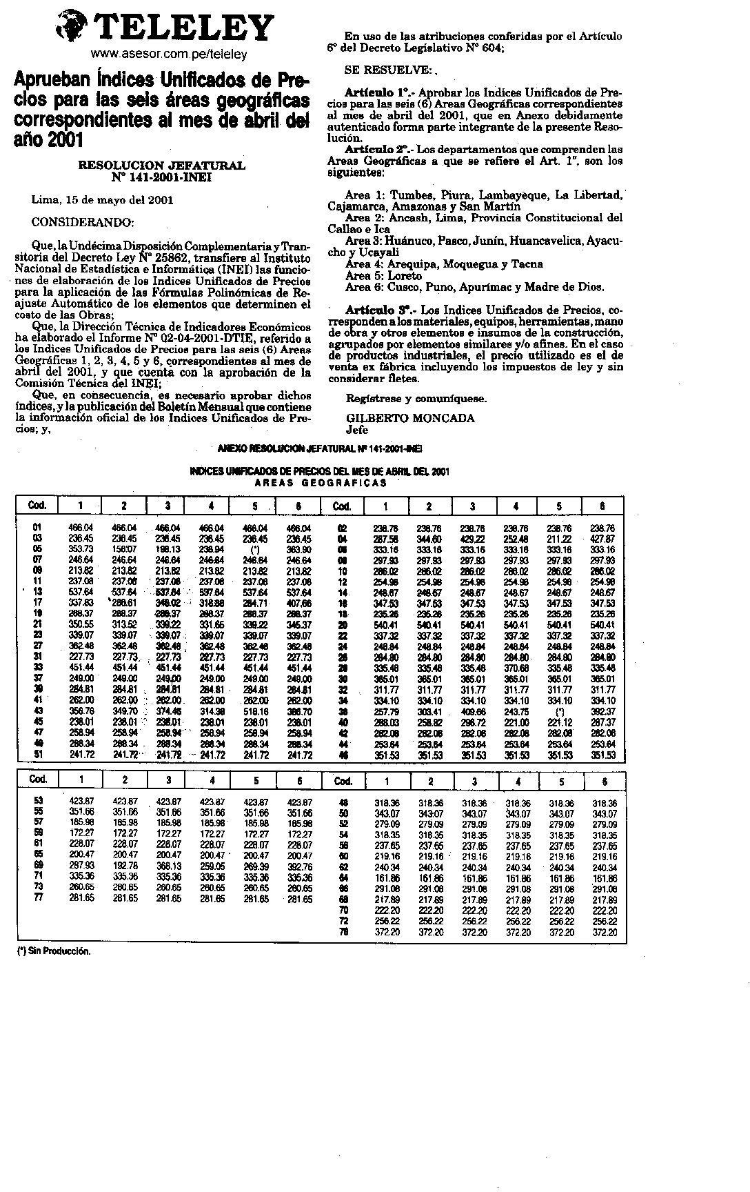APRUEBAN ÍNDICES UNIFICADOS DE PRECIOS PARA LAS SEIS ÁREAS GEOGRÁFICAS CORRESPONDIENTES AL MES DE ABRIL DEL AÑO 2001