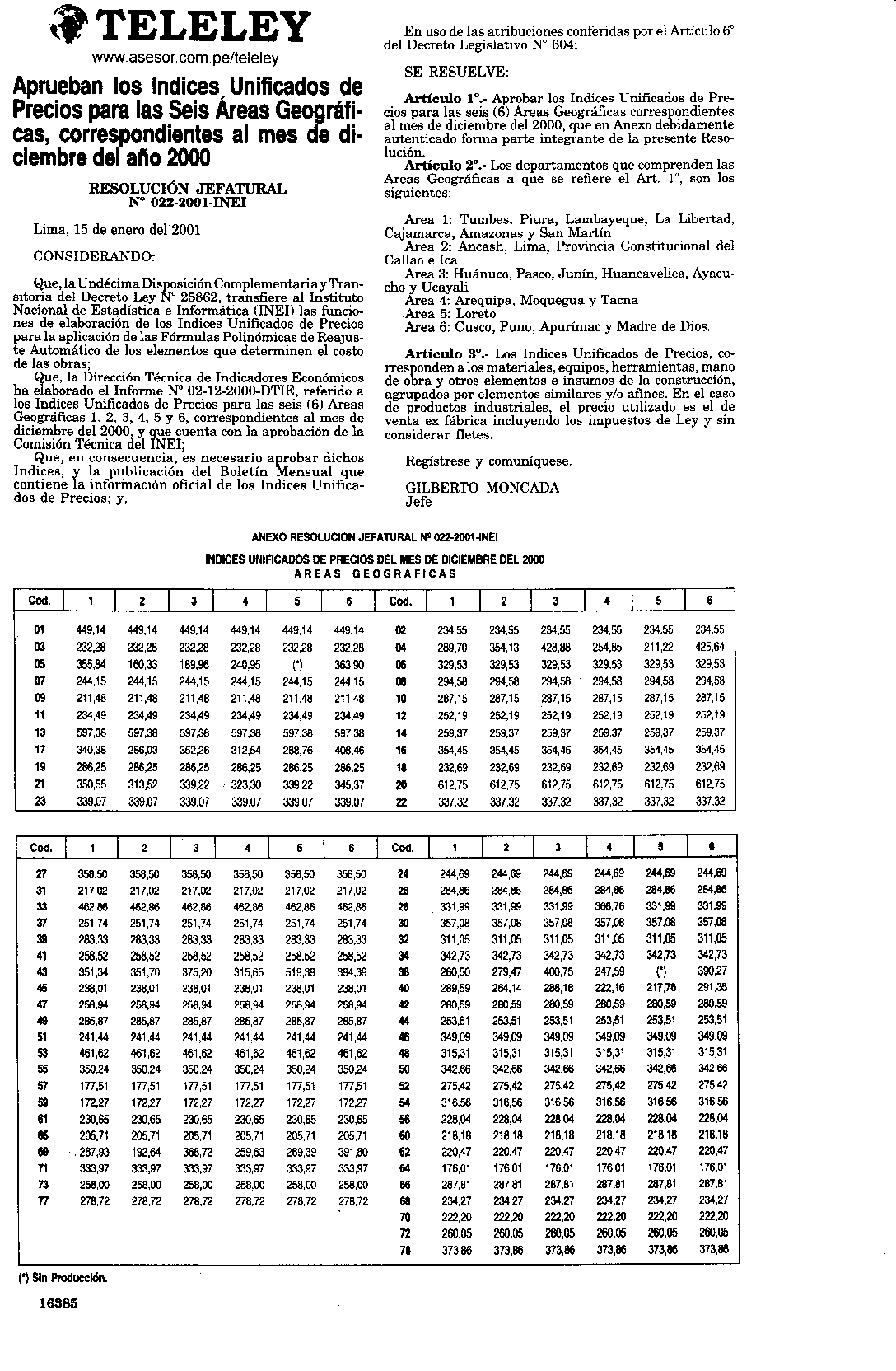 APRUEBAN LOS INDICES UNIFICADOS DE PRECIOS PARA LAS SEIS ÁREAS GEOGRÁFICAS, CORRESPONDIENTES AL MES DE DICIEMBRE DEL AÑO 2000