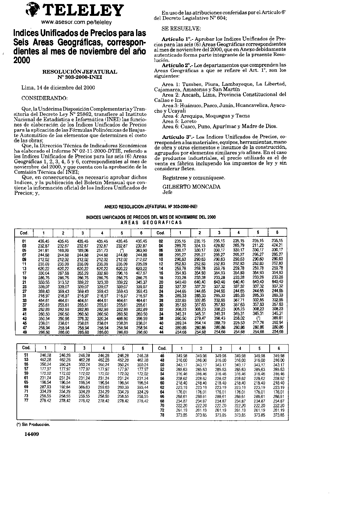 INDICES UNIFICADOS DE PRECIOS PARA LAS SEIS AREAS GEOGRÁFICAS, CORRESPONDIENTES AL MES DE NOVIEMBRE DEL AÑO 2000