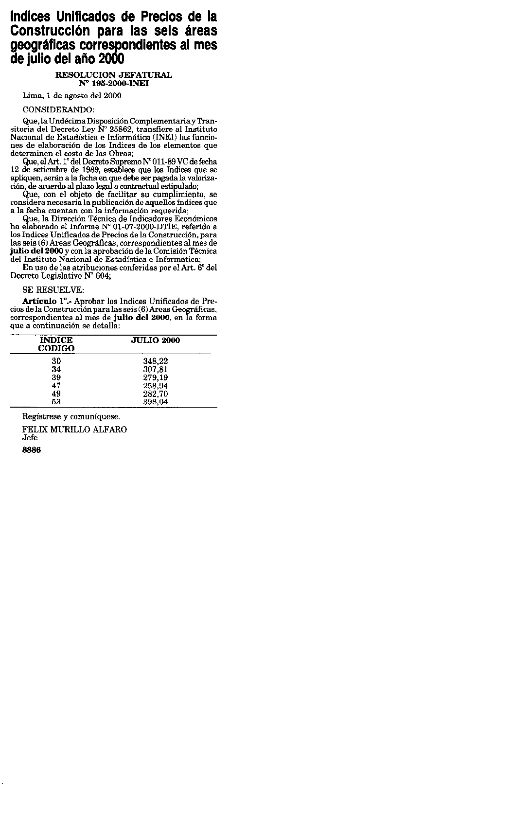 INDICES UNIFICADOS DE PRECIOS DE LA CONSTRUCCIÓN PARA LAS SEIS ÁREAS GEOGRÁFICAS CORRESPONDIENTES AL MES DE JULIO DEL AÑO 2000