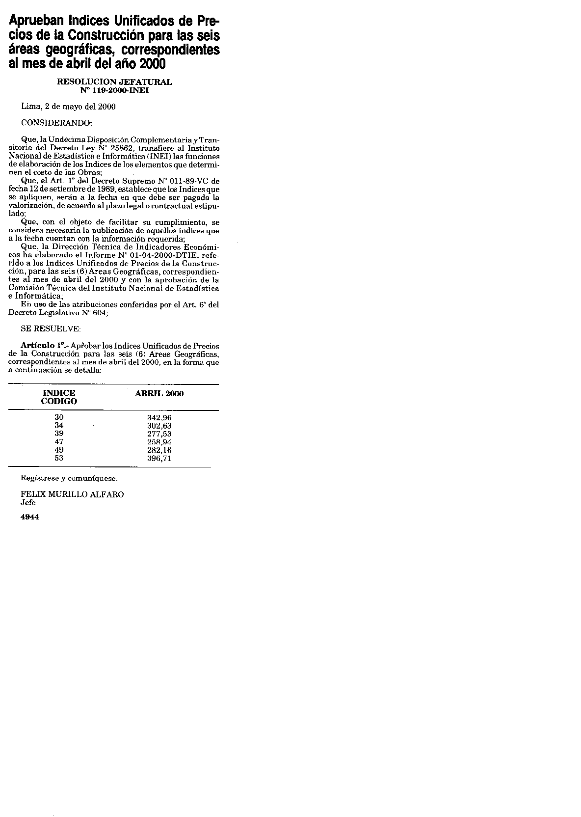 APRUEBAN INDICES UNIFICADOS DE PRECIOS DE LA CONSTRUCCIÓN PARA LAS SEIS ÁREAS GEOGRÁFICAS, CORRESPONDIENTES AL MES DE ABRIL DEL AÑO 2000