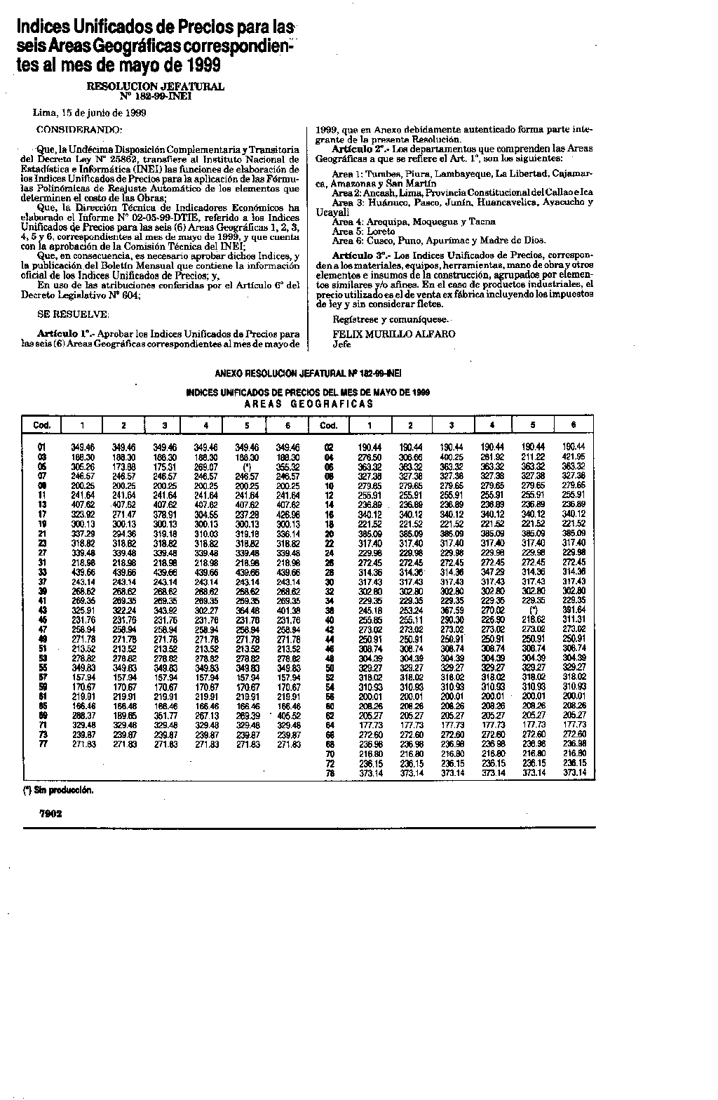 INDICES UNIFICADOS DE PRECIOS PARA LAS SEIS ÁREAS GEOGRÁFICAS CORRESPONDIENTES AL MES DE MAYO DE 1999