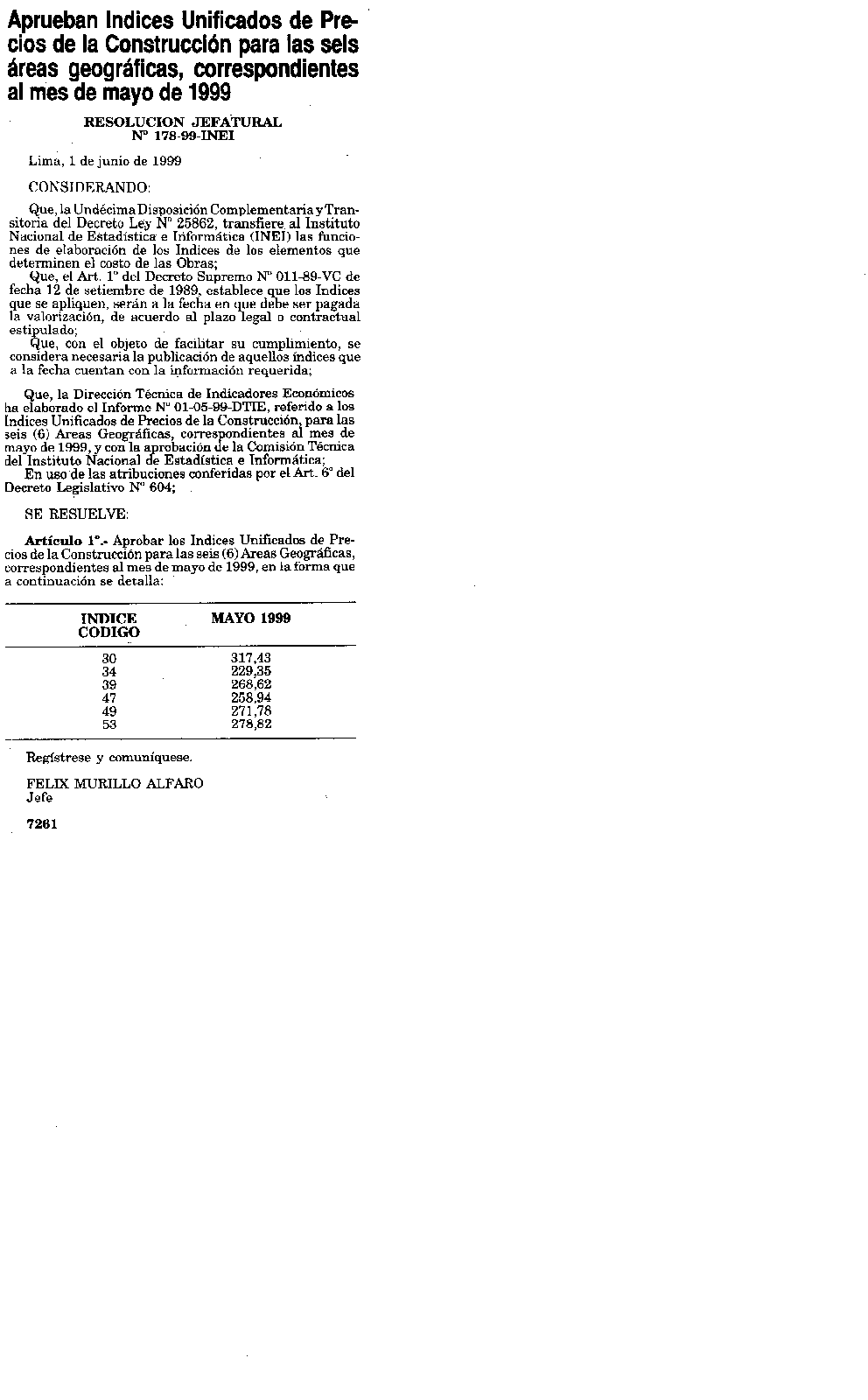 APRUEBAN INDICES UNIFICADOS DE PRECIOS DE LA CONSTRUCCION PARA LAS SEIS AREAS GEOGRAFICAS, CORRESPONDIENTES AL MES DE MAYO DE 1999