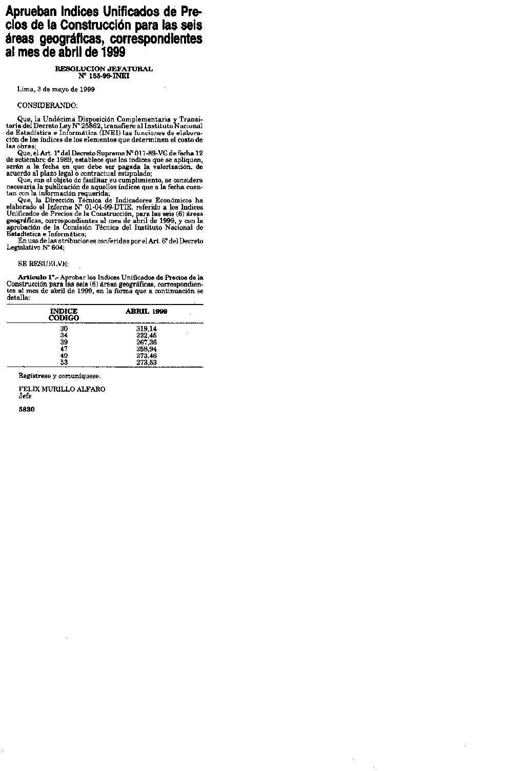APRUEBAN INDICES UNIFICADOS DE PRECIOS DE LA CONSTRUCCION, PARA LAS SEIS AREAS GEOGRÁFICAS, CORRESPONDIENTES AL MES DE ABRIL DE 1999