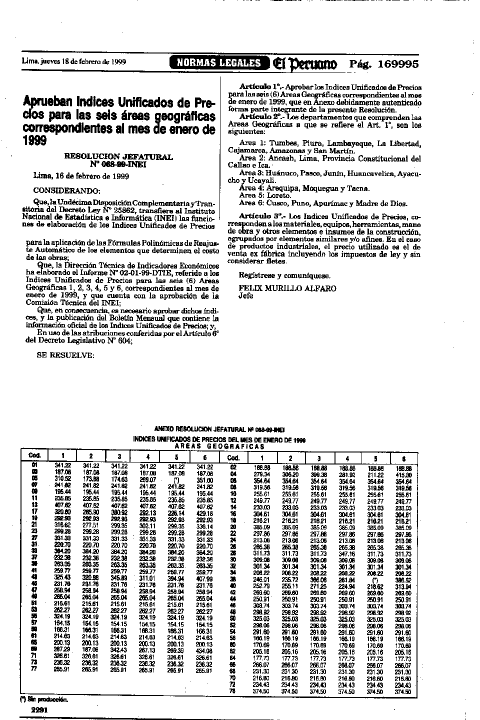 APRUEBAN INDICES UNIFICADOS DE PRECIOS PARA LAS SEIS AREAS GEOGRAFICAS CORRESPONDIENTES AL MES DE ENERO DE 1999